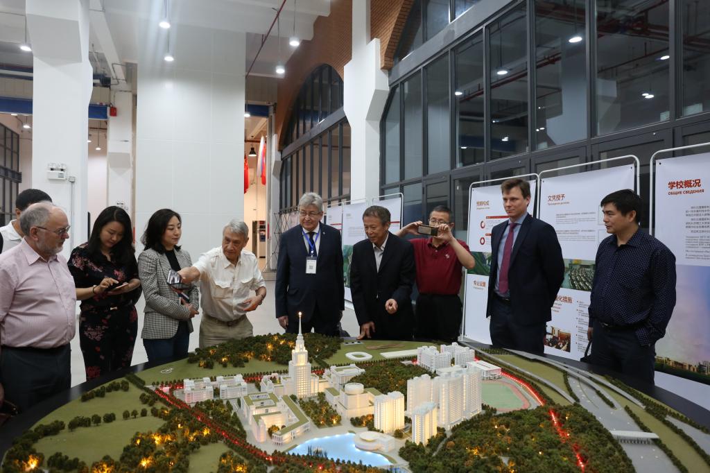 趙平校長、塔拉索夫副校長、張建中副校長以及學校部門負責人熱情接待來訪客人。俄羅斯科學家們首先參觀了永久校區的校園建設工地,隨后來到在過渡校區沙盤前,由張建中副校長為考察團成員詳細介紹我校永久校區的建設規劃情況。
