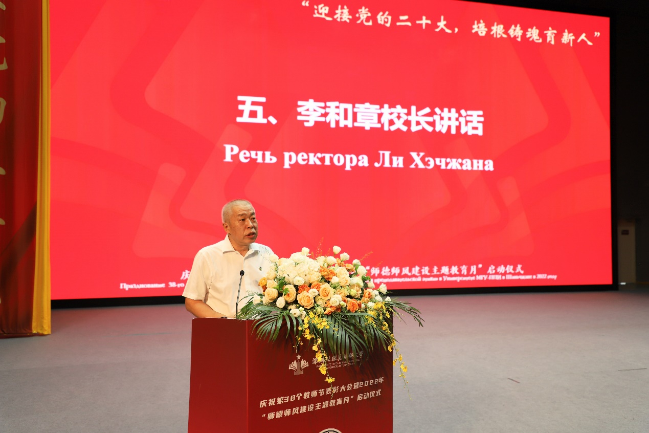 9月8日下午,深圳北理莫斯科大學在學校禮堂隆重舉行慶祝第38個教師節表彰大會暨2022年“師德師風建設主題教育月”啟動儀式。本次大會以“迎接黨的二十大,培根鑄魂育新人”為主題,著力營造尊師重教氛圍,提升教師獲得感、榮譽感和幸福感。深圳北理莫斯科大學校長李和章,第一副校長謝?米?沙赫賴,黨委書記、副校長朱迪儉,黨委副書記、紀委書記陳超峰,各系主任及部分教職工通過現場或線上方式出席了大會。