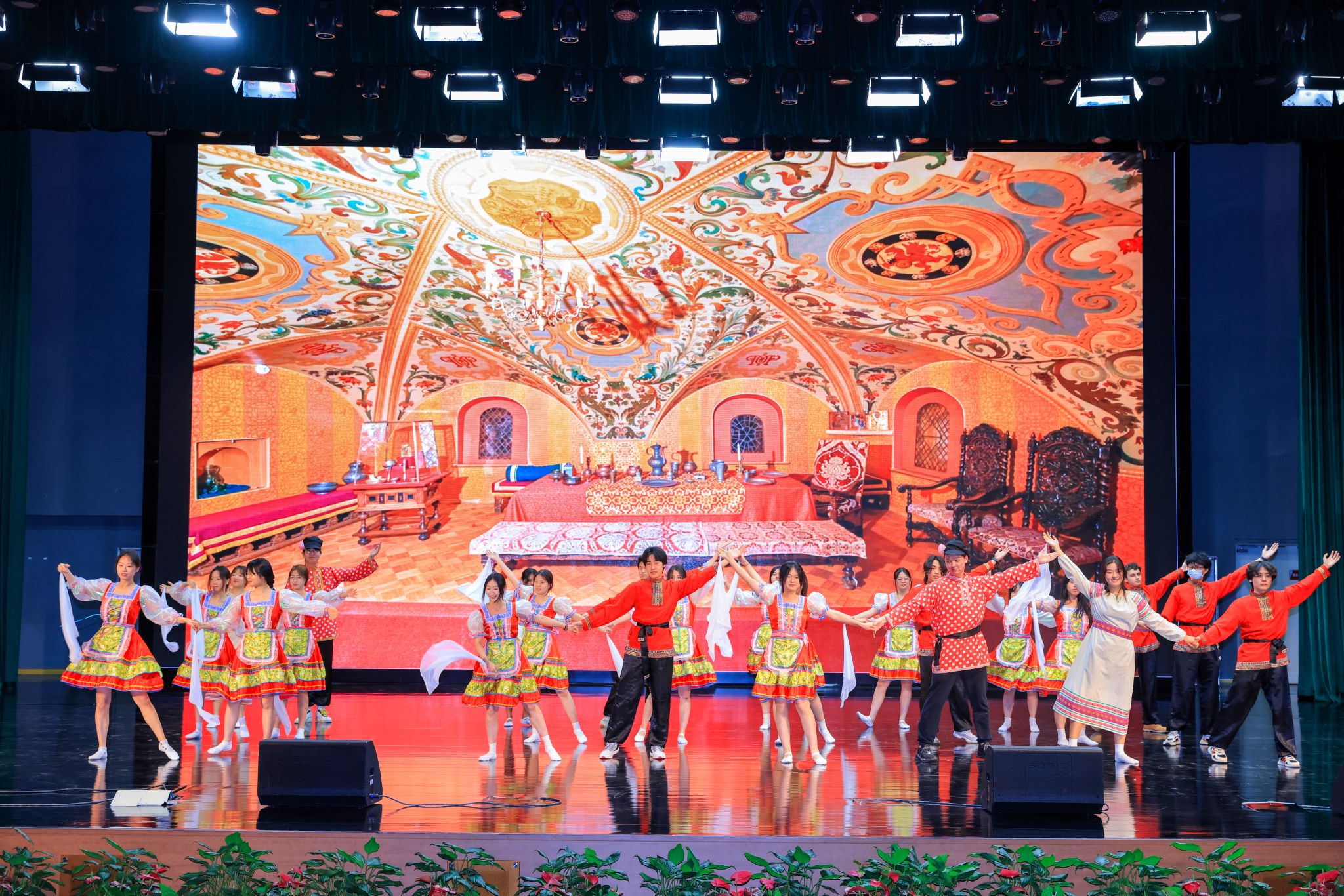 來自“對話”國情興趣小組的學生們準備了一個特別的節目。他們將傳統的彼得魯什劇院的主人公與《西游記》中的人物巧妙地結合在一起,開啟了一次美妙的俄羅斯之旅,帶領觀眾了解了俄羅斯的許多有趣景點、文化和美食傳統以及優美的自然風光。