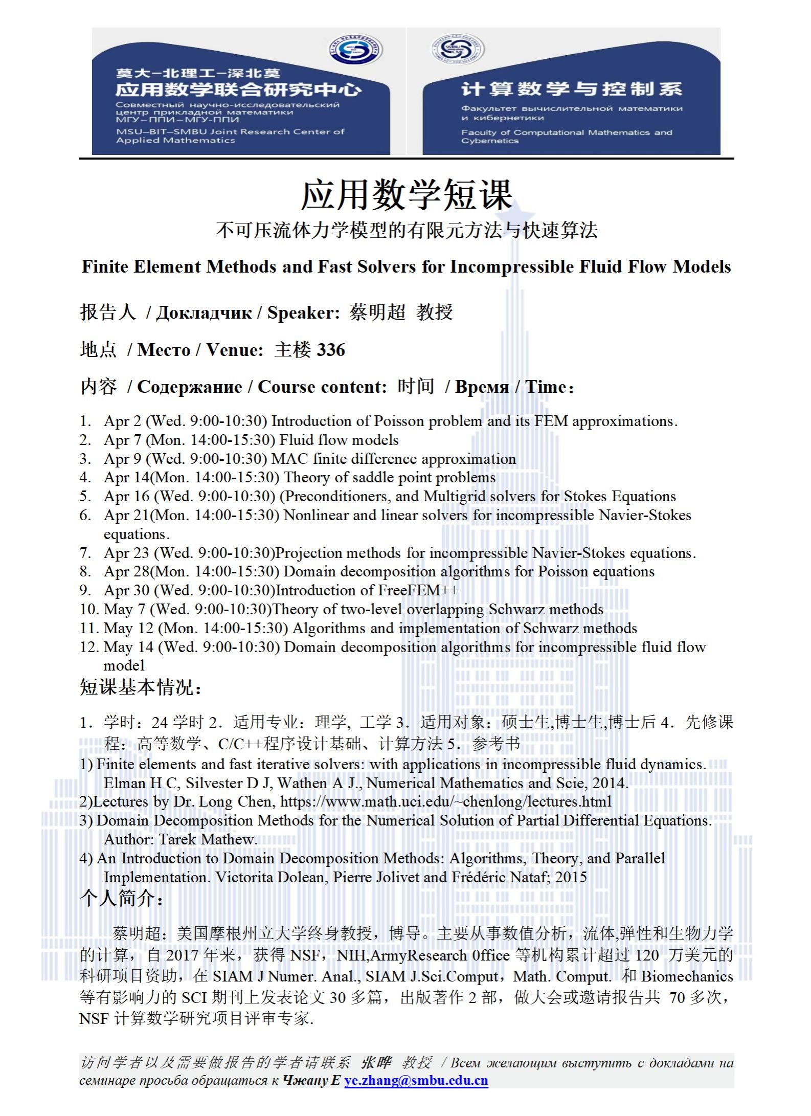 【講座預告】應用數學短課——不可壓流體力學模型的有限元方法與快速算法(蔡明超 教授)