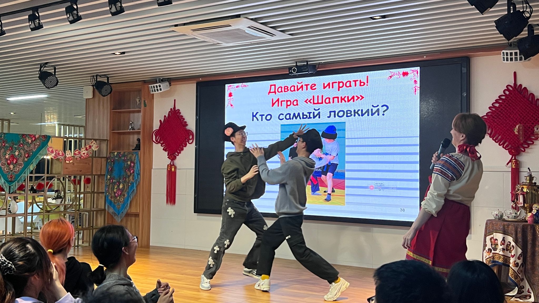 活動現場舉行了許多比賽和游戲:說出關于“謝肉節”的俄語諺語和俗語、卷“繩子”游戲(誰更快地把繩子卷到木棒上)、搶“帽子”游戲(誰更快地摘下對手頭上的帽子)、“新郎”(誰能在跳舞時機智地從女孩手中搶到手帕),以及拼單詞游戲(兩個隊從所給的字母中快速拼出與謝肉節相關的單詞)等。