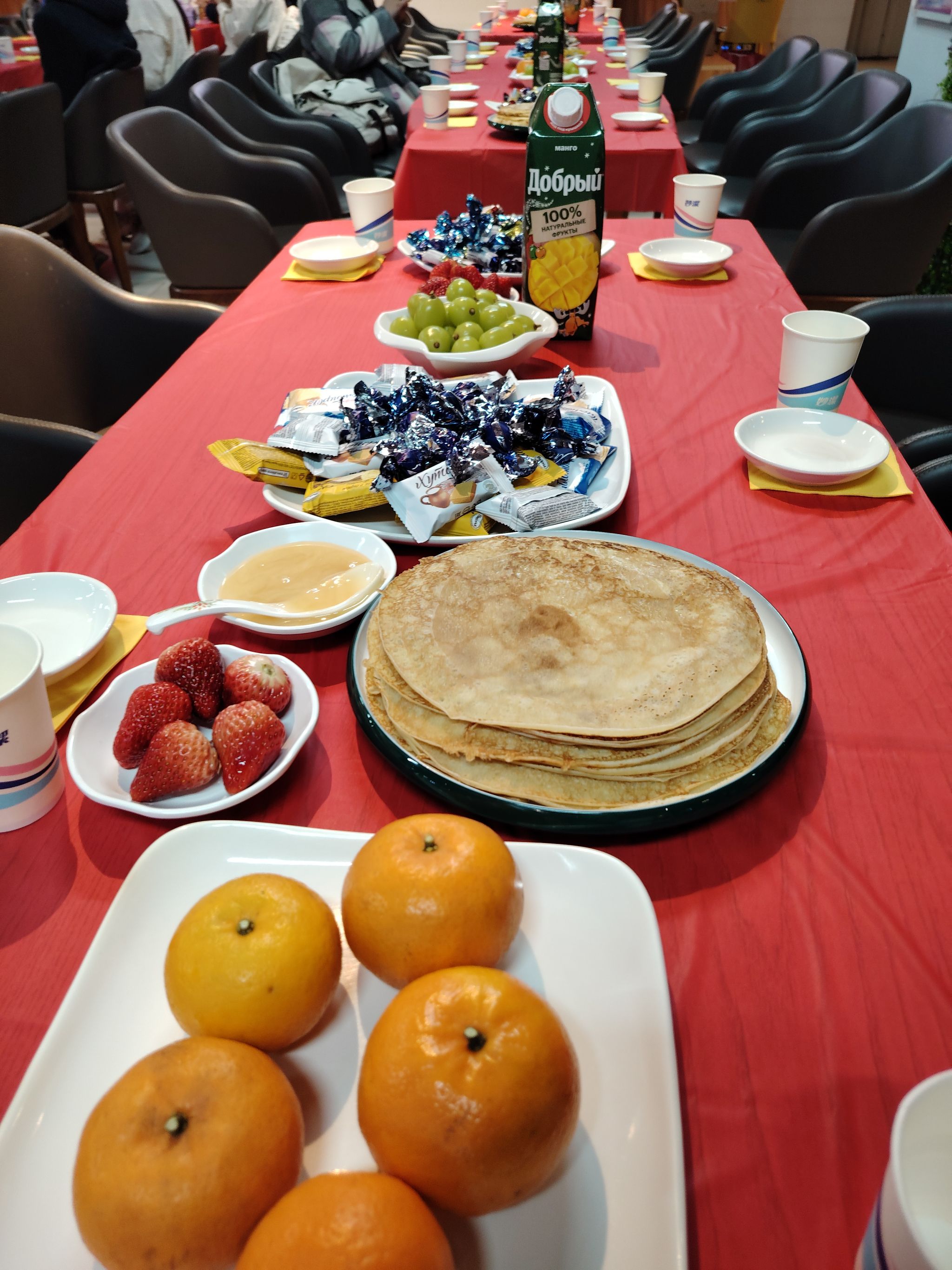 3月13日,深圳北理莫斯科大學俄語中心舉辦了俄羅斯民間節日——“謝肉節”歡慶活動。為期7天的“謝肉節”在俄羅斯是非同尋常的一周,俄羅斯老師與同學們滿懷期待,共同慶祝這一節日。活動現場“謝肉節”的傳統食物--焦黃熱乎的薄餅,還有俄羅斯老師親手做的“花邊”家常小薄餅,桌上還擺滿了香甜的蜂蜜和果醬、新鮮漿果和水果、糖果和蜜糖餅干。當同學們看到擺放漂亮、美食豐盛的餐桌時,甚是驚喜。